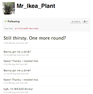 Die Firma Botanicals bietet ein kleines Twitter Kit für Zimmerpflanzen an. Ich schätze mal ein Sensor misst dabei die Feuchtigkeit und twittert dann entsprechende Nachrichten. Wie zum Beispiel bei Mr. Ikea Plant hier: